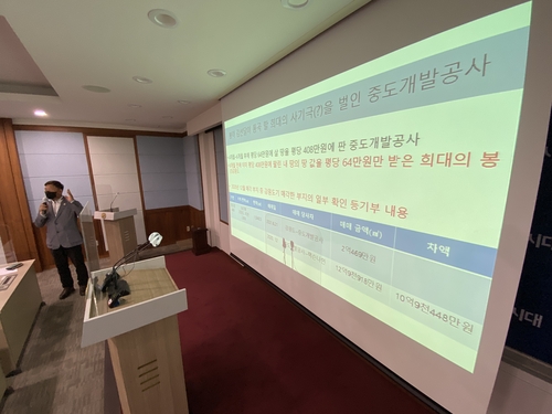 <하중도 관광지 內 레고랜드 인근 상가 시설 부지 특혜 매각 의혹 관련 기자회견문> - 자본금 1억1천 만원 회사가 춘천시 하중도 관광지 854억 토지 매입과 상가 개발 사업 진행!! - 하중도 관광지 상가부지 특혜 매각 즉각 중단하라!! 1. 개요 강원도, 중도개발공사는 민간 사업자 ㈜ 000 외 1곳과 ...