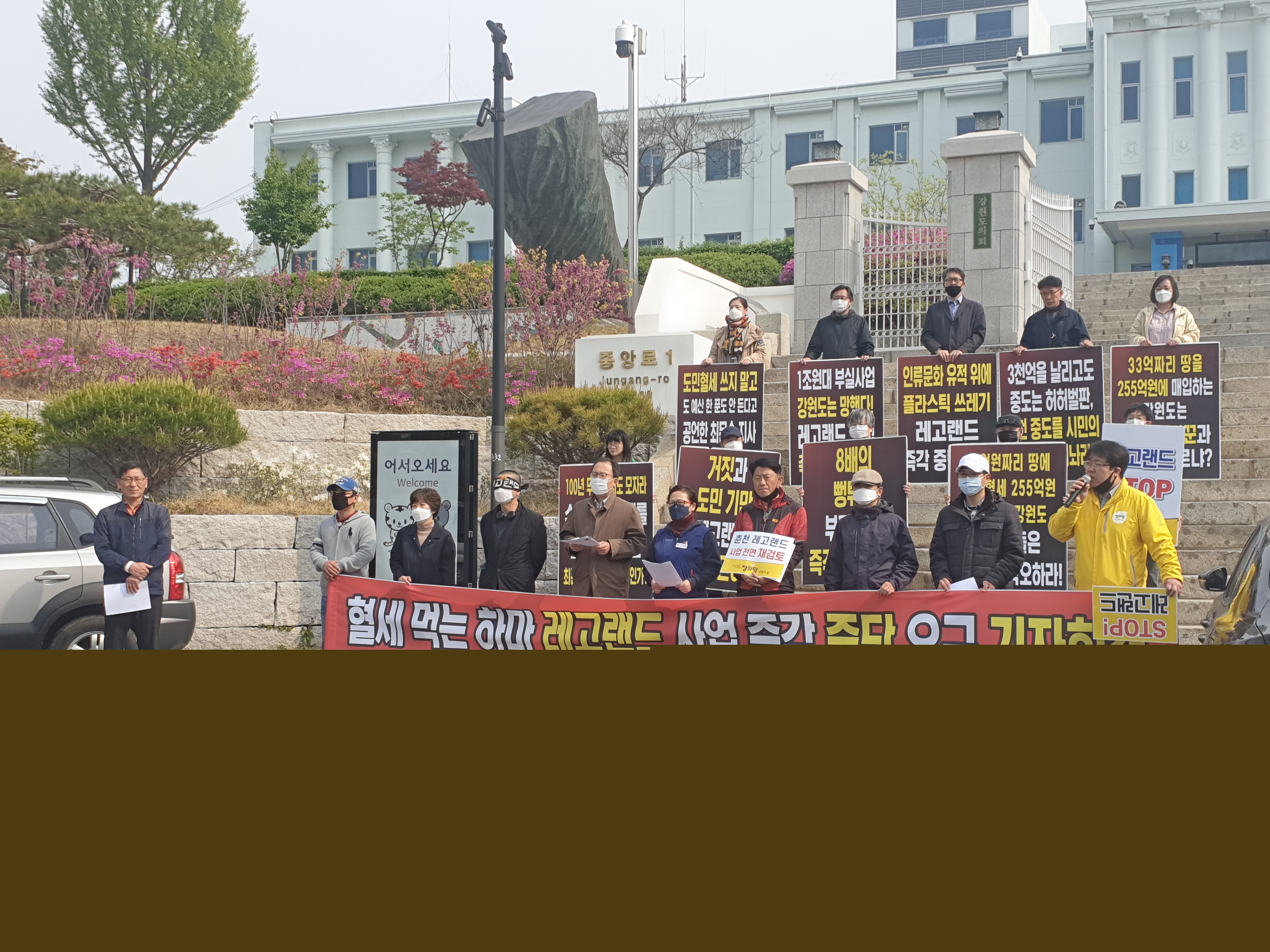 혈세 먹는 하마 레고랜드 즉각 중단하라! 최문순 지사는 도민 앞에 사과하고 책임자를 처발하라! 도박장 유치를 운운한 도의원은 즉각 춘천시민에게 사과하라! 도민의 대의기관임을 포기한 강원도 의회는 즉각 해산하라! 레고랜드 사업이 알펜시아 부실을 넘어 혈세 먹는 하마로 전락했다. 도민혈세 3,000억원이 넘게 투입되...