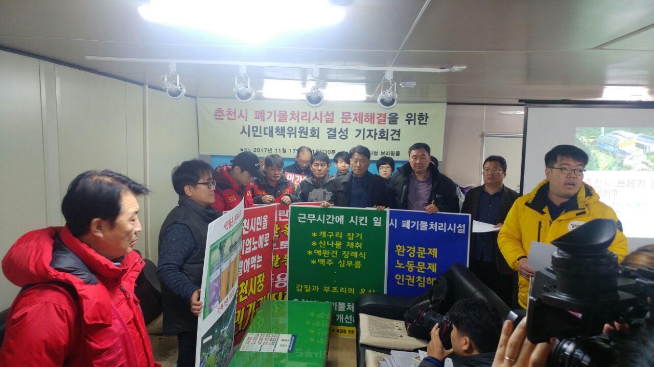 "춘천시는 폐기물 처리시설 민간위탁 문제 해결을 위한 구체적인 대안을 제시하라" 11월 17일 오전 10시 30분, 춘천시청기자실에서 진행했습니다. 주최 : 춘천시폐기물처리시설 문제 해결을 위한 시민대책위원회 (춘천시민사회단체네트워크(춘천경실련, 춘천나눔의집, 춘천두레소비자생협, 춘천민예총, 춘천생명의숲, 춘천시민연대...