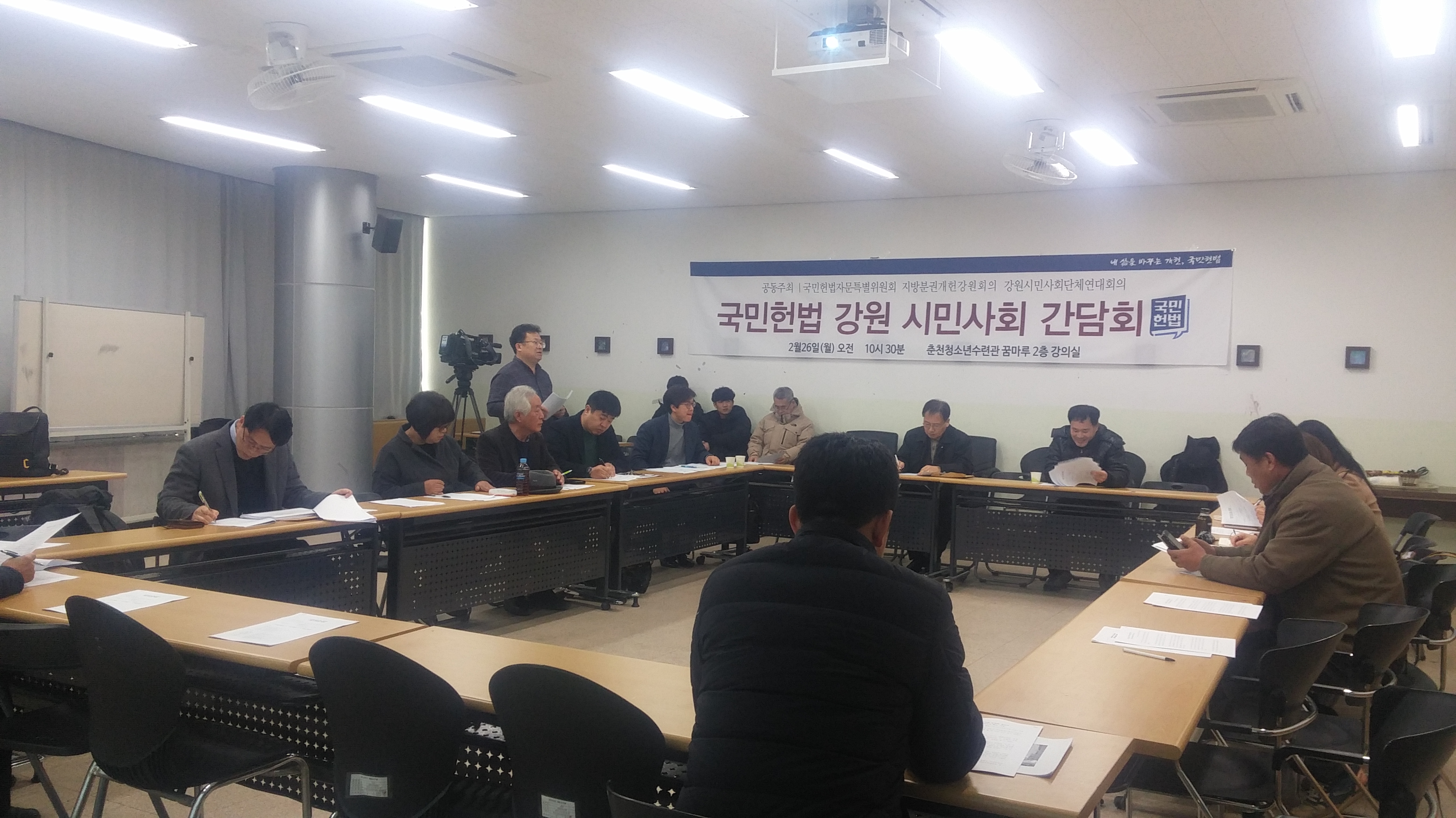 - 2월 26일 오전10시 30분~12시 30분, 청소년수련관꿈마루 2층 강의실 - 공동주최 : 국민헌법자문특별위원회, 지방분권강원개헌회의, 강원시민사회단체연대회의 - 사회 : 강원시민사회단체연대회의 윤도현 사무국장 국민헌법자문특위가 먼저 국민헌법 취지, 일정 등을 설명했습니다. 이후 지정토론하고 자유토론을 진행했습니...